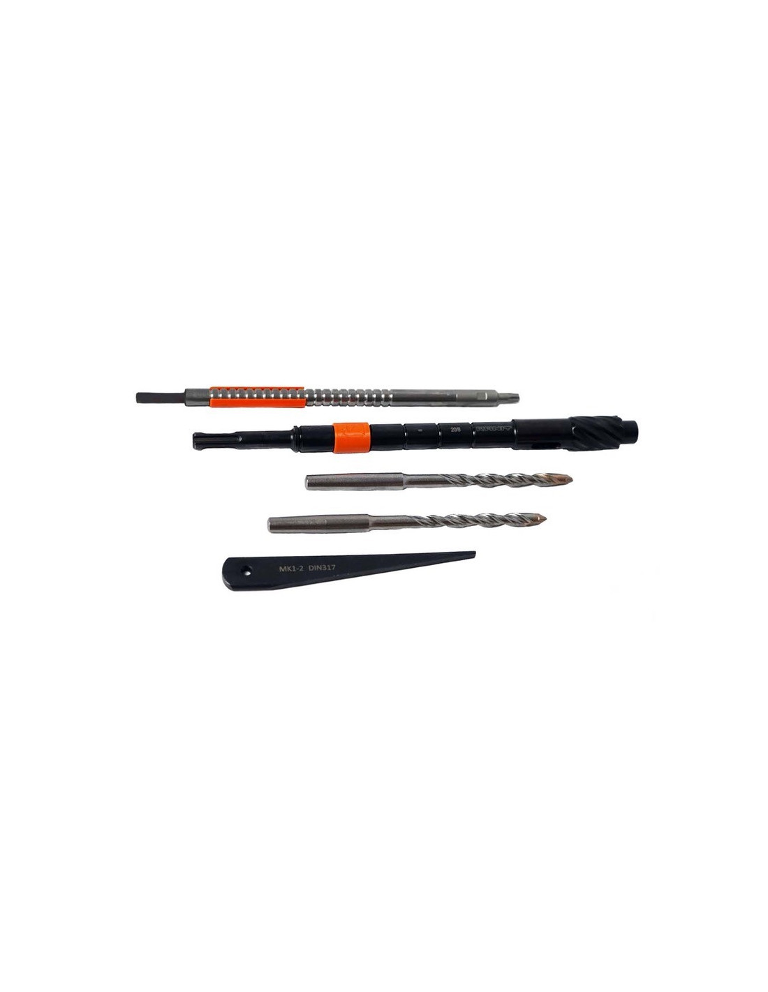 EVO „startovací“ Montážní sada obsahuje potřebné nářadí na montáž hmoždinky IsoFux Rocket EVOlution Sada obsahuje:1 ks EVO Vrtací adaptér|1 ks EVO Distance Control T30| 3 ks vrtáků 8x80x155 mm s kuželovou stopkou|1 ks klínový vyrážeč vrtáků