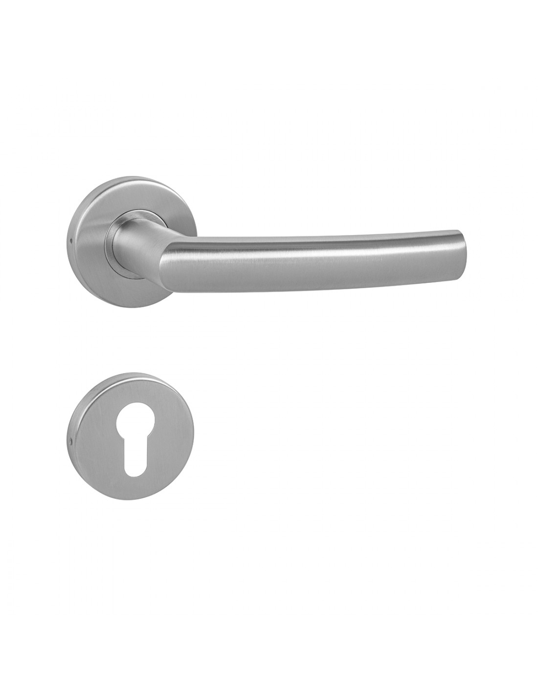 Rozetová klika na interiérové dveře s kulatou rozetou z vysoce kvalitní nerezavějící oceli, známé jako nerez a je povrchově upravena. Rozeta má průměr 54 mm a tloušťku 9 mm. Je barevně stabilní a odolná vůči opotřebení. Kování je testované podle normy ČSN EN 1906:2012 na 200 000 cyklů.