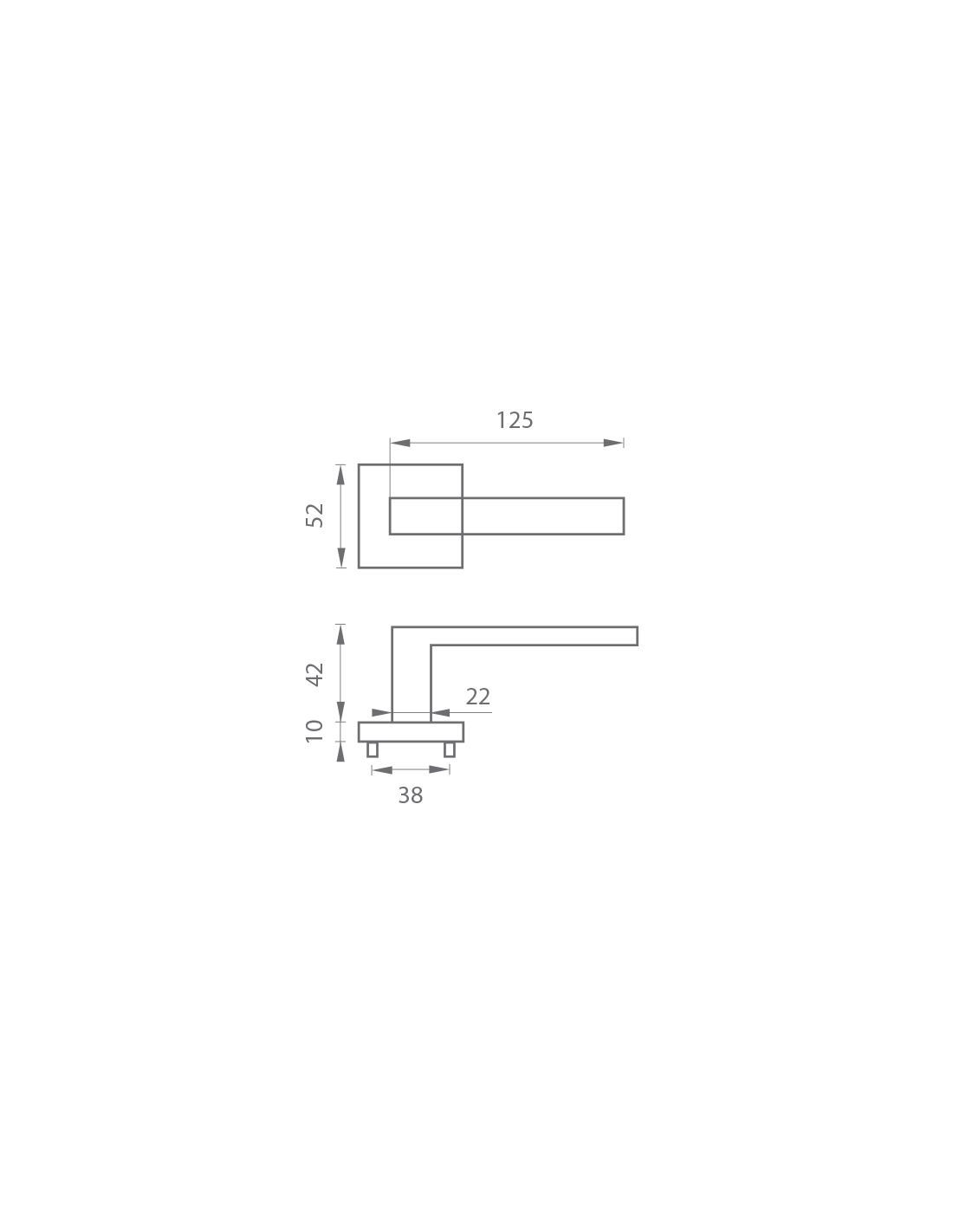 Rozetová klika na interiérové ??dveře s hranatou rozetou je vyrobena odléváním z kvalitních slitin zinku a hliníku a je povrchově upravena. Rozeta má rozměry 52 mm x 52 mm a tloušťku 10 mm. Klika je povrchově upravována galvanizací a vyznačuje se vysokou odolností proti korozi. Kování je testováno na 100 000 cyklů.